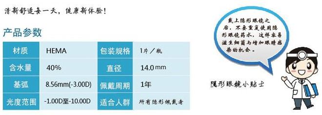 產(chǎn)品說(shuō)明: ★鏡片采用先進(jìn)離心澆鑄工藝制造,表面質(zhì)量光滑,配戴更舒適 ★邊緣減薄且結(jié)構(gòu)穩(wěn)定,與角膜生理結(jié)構(gòu)完全吻合,使您擁有無(wú)可比擬的舒適度 ★含有獨(dú)特的保濕因子能有效的鎖住水份,使你的眼睛長(zhǎng)期保持潤(rùn)澤舒適