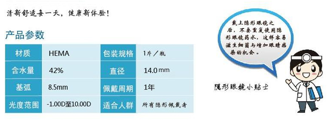 ★材料中含有透明質(zhì)酸酶,為仿生物高分子材料合成,與角膜有高度的親和力,提高鏡片透氧性,配戴安全舒適